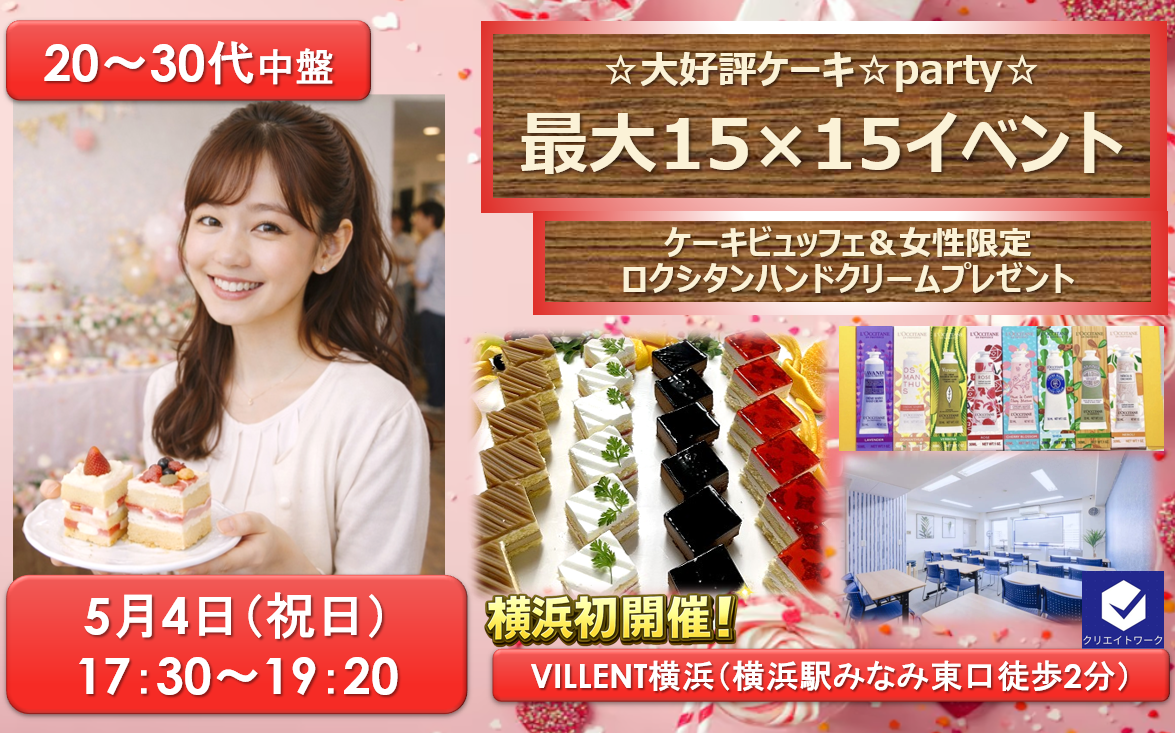 『超早割中』【横浜初開催・大人気ケーキParty・抽選会あり】☆★最大30名☆★20才~35才の婚活イベント!女性限定特典あり!